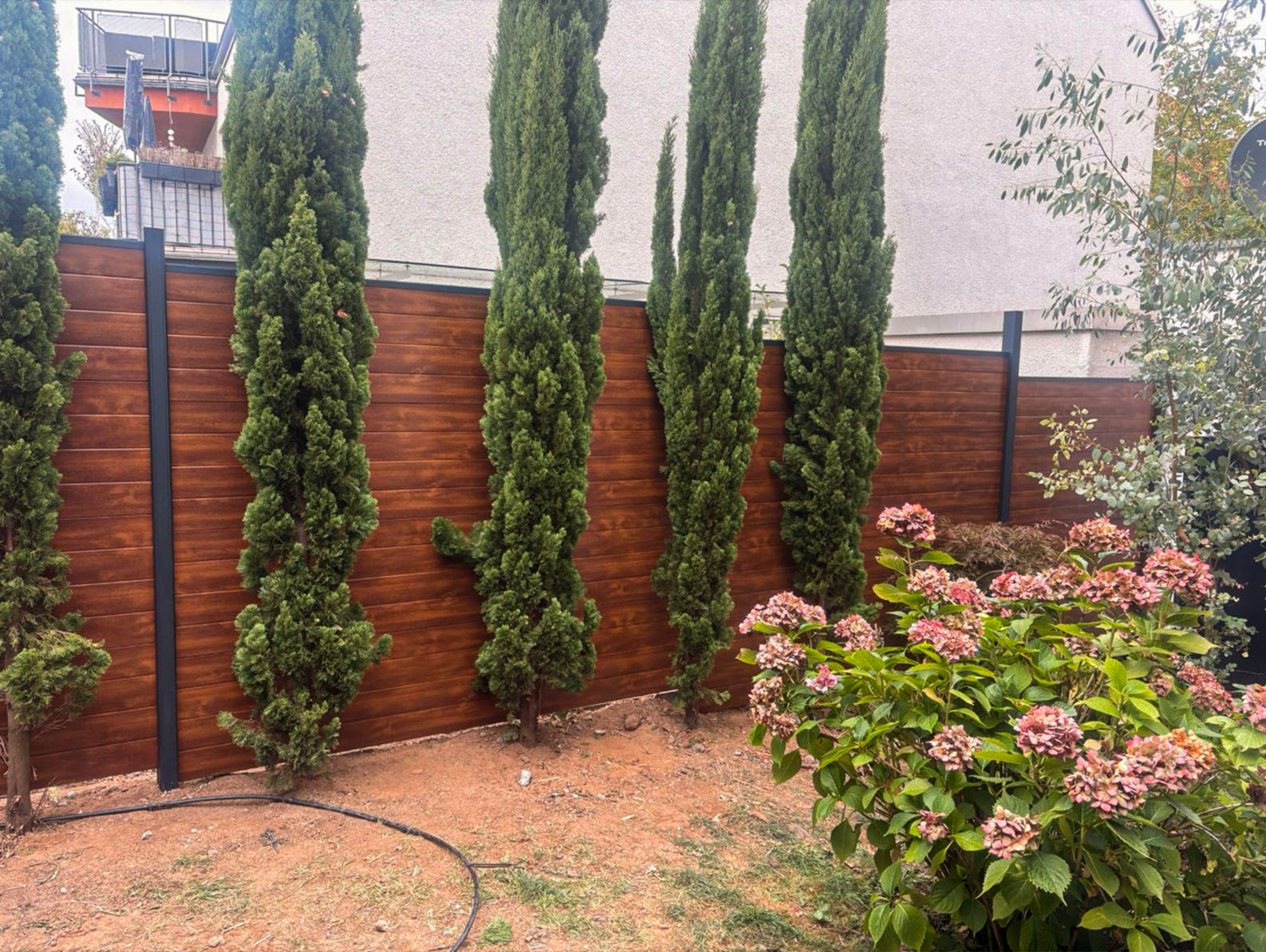 Wir arbeiten ausschließlich mit geprüften Schallschutzelementen, die sich im Außenbereich langfristig bewähren. Systeme wie der Silento 27 oder vergleichbare Konstruktionen erreichen – abhängig von Aufbau und Höhe – Schallreduzierungen von bis zu ca. 27 dB unter Laborbedingungen. Das bedeutet spürbar weniger Lärm im Garten. Die Paneele können je nach Modell gedreht (glatt oder Lamellen), farblich angepasst oder in der Höhe kombiniert werden – für ein harmonisches Gesamtbild.